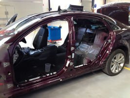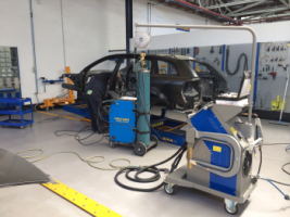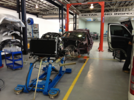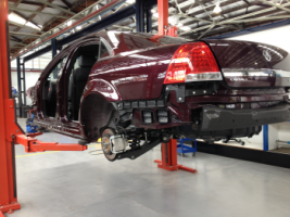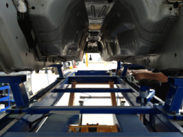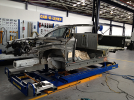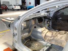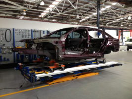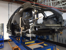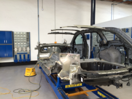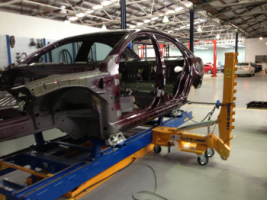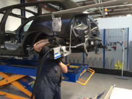 Once the vehicle has been stripped and prepared for repair the technician will further assess the damage. They check the inside and outside of the vehicle body to determine if any damage exist on body components that are not being replaced. Using electronic measuring equipment they measure the body to determine if it meets OEM measurement specification. When the body requires alignment the technician will use hydraulic aligning equipment to straighten the body and bring it back to OEM specification.